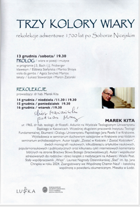 W niedzielę po Mszach św. o godz. 11, 30 i 19, 30 oraz w poniedziałek i wtorek po Mszy św. o godz. 19, 30 nauki rekolekcyjne, które poprowadzi Pan Prof. Marek Kita, dr hab. teologii i filozofii. Serdecznie zapraszamy.